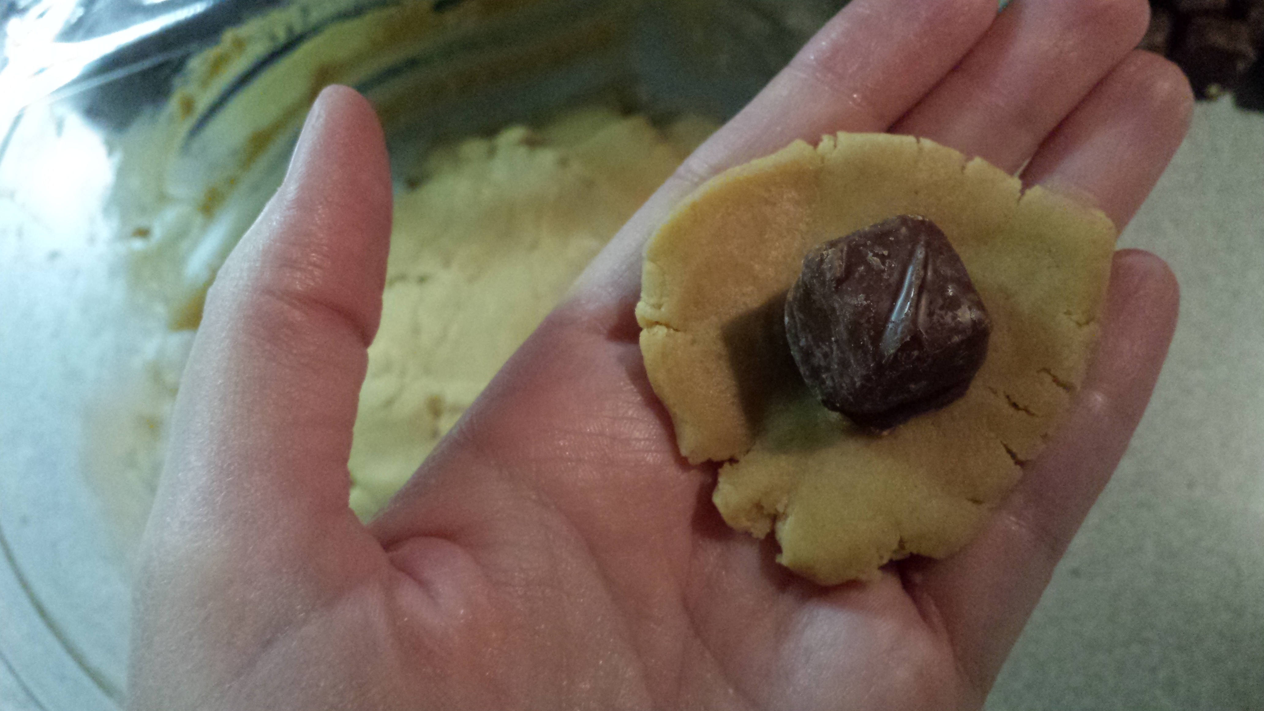 7. After chilling time has passed, remove dough from refrigerator, divide into tablespoon-sized pieces and flatten.  Place a piece of Snickers bar in center.
