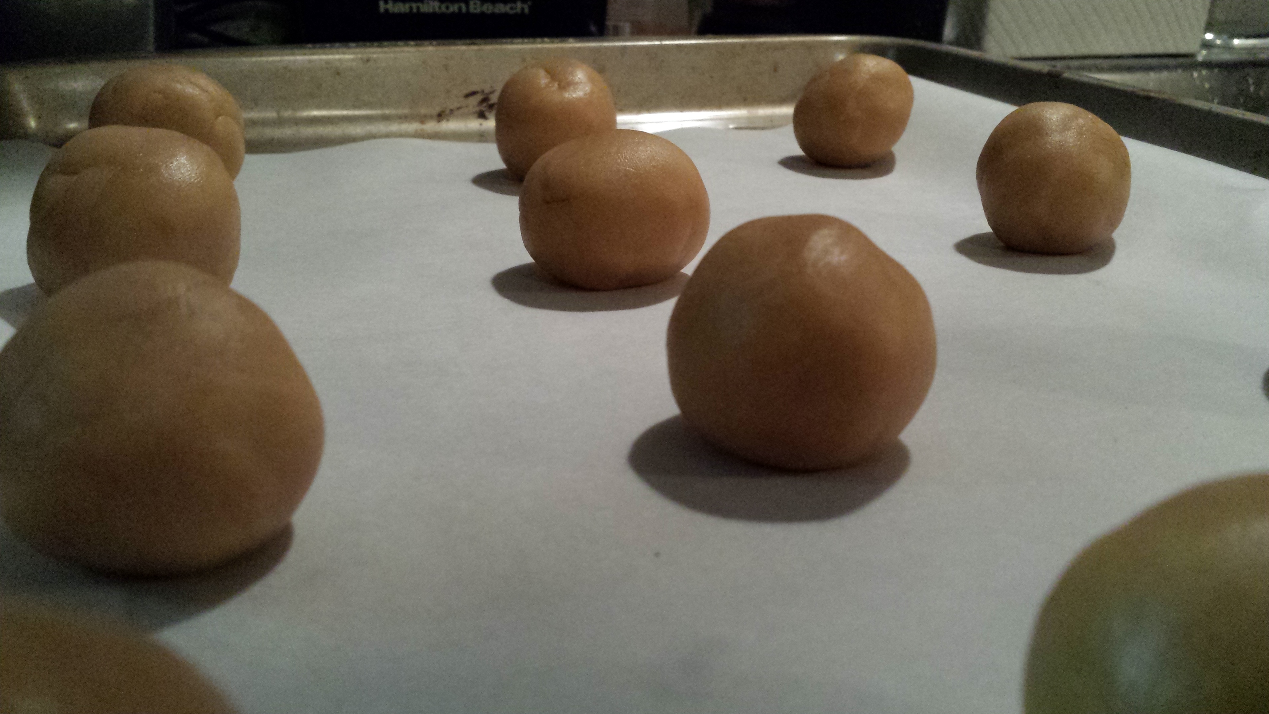 8. Form dough into balls around each Snickers bar.  Place on a greased baking sheet (I’ve used parchment paper instead).