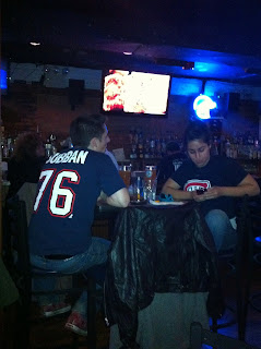 About half way through the first period, more Habs fans joined us. I approached a couple with matching Habs shirts to introduce myself. Out of the blue, the guy says, “Are you Chris?” They had googled “NYC bars, Habs” to find out where to go for the game. Fortunately, they found my blog post from last year about the Blue Moon Cafe (see link above for “Habs in NYC: Blue Moon Cafe”) and turned up without even knowing the Habs Tweetup was taking place! We quickly invited them to join our group.
