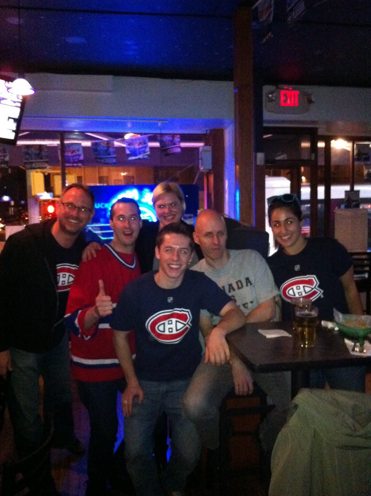 About half way through the first period, more Habs fans joined us. I approached a couple with matching Habs shirts to introduce myself. Out of the blue, the guy says, “Are you Chris?” They had googled “NYC bars, Habs” to find out where to go for the game. Fortunately, they found my blog post from last year about the Blue Moon Cafe (see link above for “Habs in NYC: Blue Moon Cafe”) and turned up without even knowing the Habs Tweetup was taking place! We quickly invited them to join our group.
